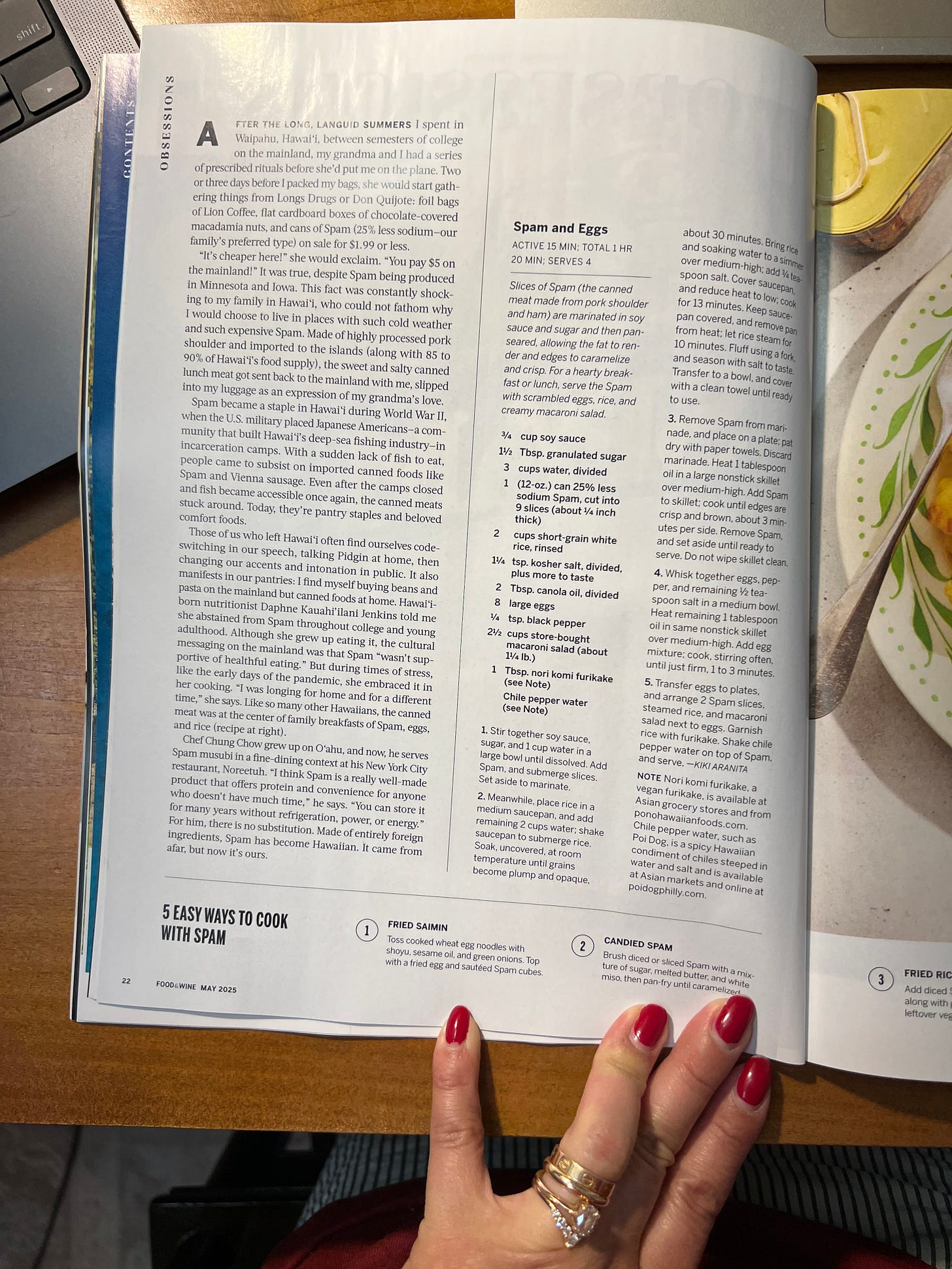 I wrote a recipe non-recipe for Spam and Eggs for Food and Wine (it’s in print this month but the link will take you to the digital edition). The accompanying article is the same one that won the MFK Fisher Prize, but truncated for print.